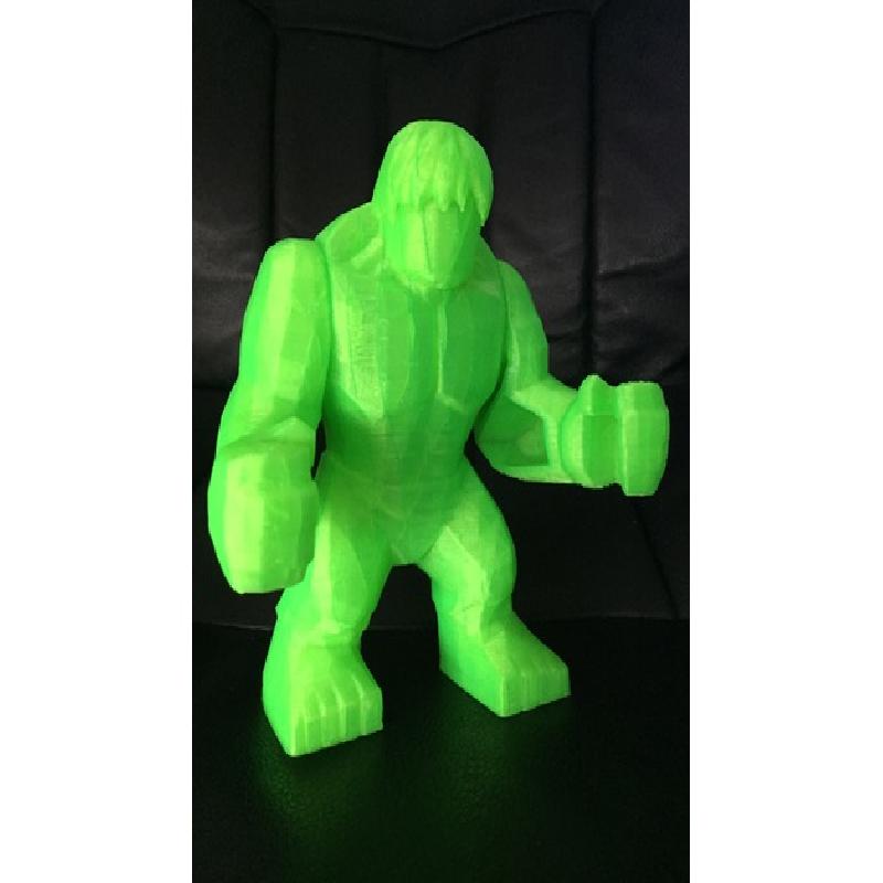Lego + Hulk = LEGO HULK !!! Total print time was ~13 hours, and overall it came out great! The print requires supports for the arms, which I super glued to the body. Timelapse of print, plus bed removal, support removal, super glue.