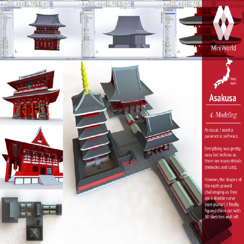 I used parametric software to model everything from scratch - it was pretty easy but tedious as there are many details (extrudes and cuts). Hovever, the shapes of the roofs were challenging as they are a double curve (non-planar). I finally figured them out with complicated 3D sketches and lofts.