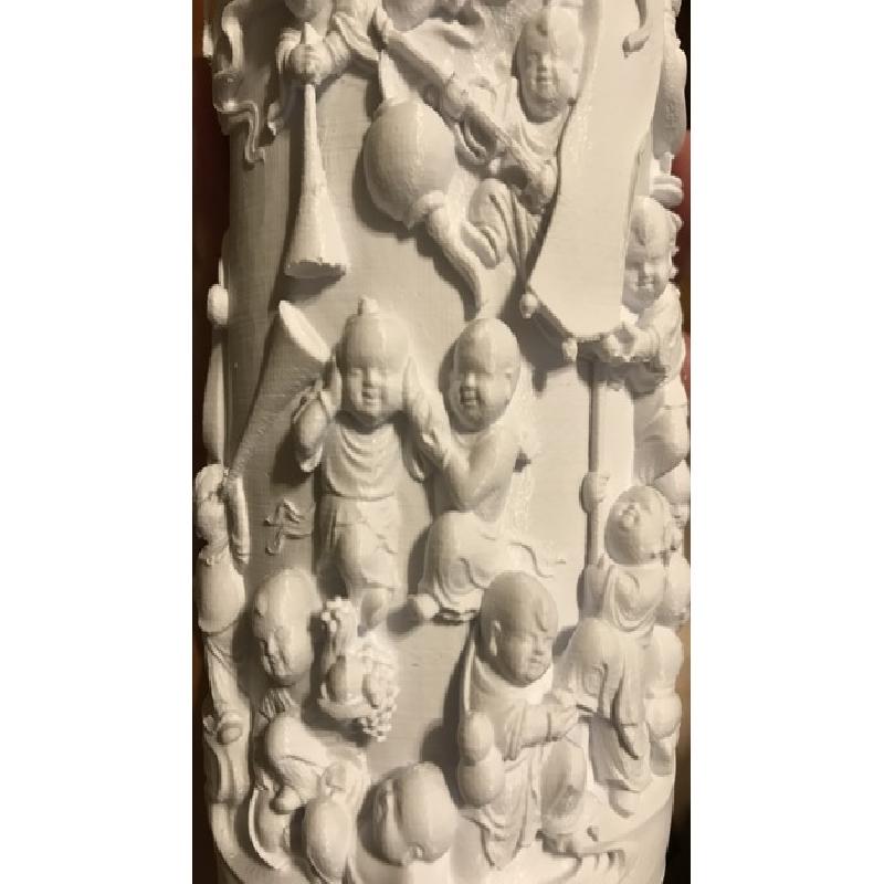 The original art piece was a fan painting (on a hand fan, not by a "fan") by Su Hanchen (苏汉臣), circa 1150 CE. The "hundred kids" pen holders are typically bamboo carves of the same subject. Stronghero3d made a highly detailed 3d sculpture in the style of a bamboo carve (thank you!) but it was only a surface and prints solid. I remixed it into a proper pen holder.
