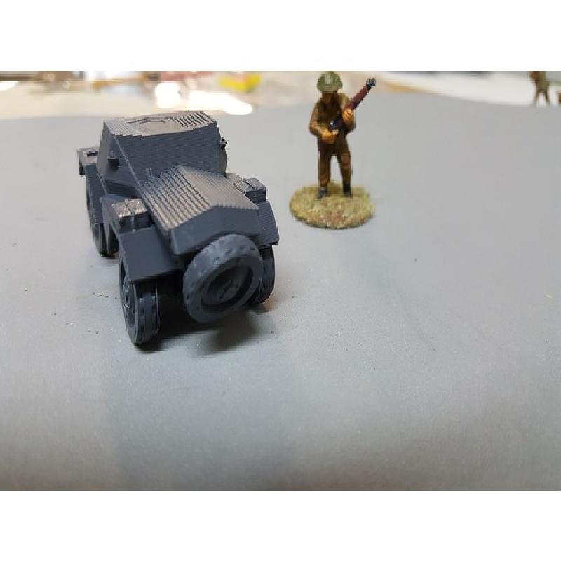 This is an .stl file of a 28mm scale (1/56) of a British Dingo armoured scout car. I made it from marcusmole's excellent 1/100th file http://www.semaker.com/productdetail/8115. I up-sized it to a correct 1/56th, and removed the attachd road wheels and spare wheel, and made five separate wheels; four for the road wheels and one spare. I added axles and a spur nub to mount the spare at the rear.