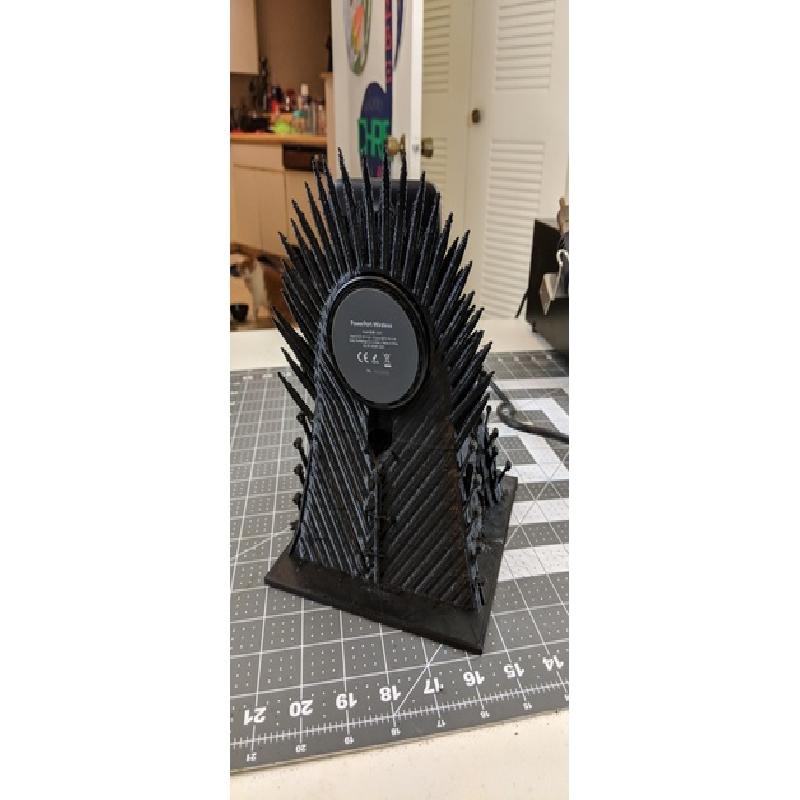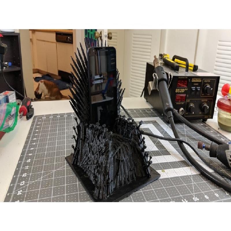 The Iron Throne from the Game of Thrones, converted into a phone stand with an embedded Qi wireless charger in the back. Designed to fit an iPhone X, but should fit most phones without bulky cases.