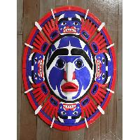 This is a redesign of an 18th century artifact from the Northwest Coast of North America, by the Nuxalk tribe of Native Americans. It represents the sun, surrounded by the four supernatural carpenters who created the world according to the myth. In the theater, it was hoisted and lowered to represent the passage of time.