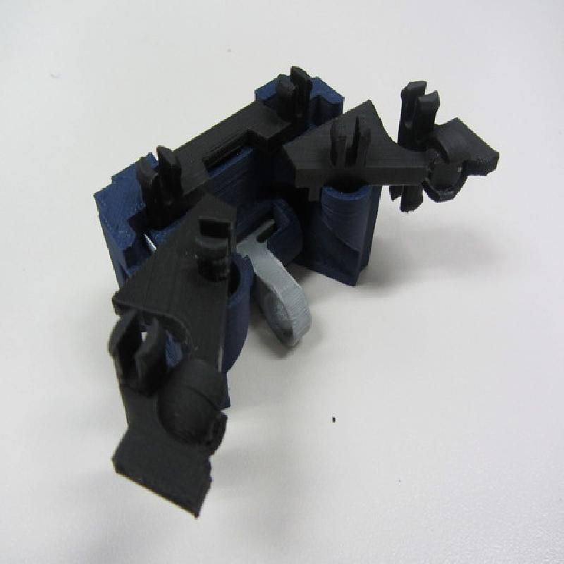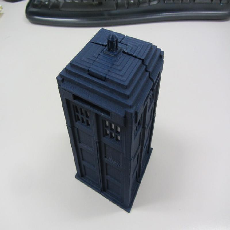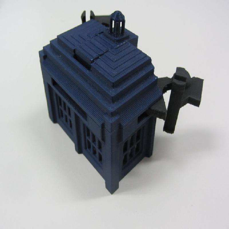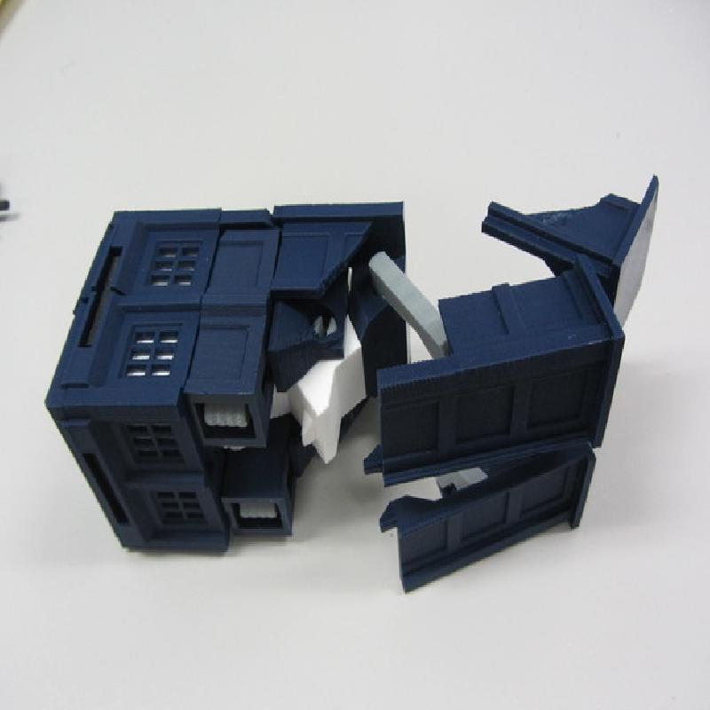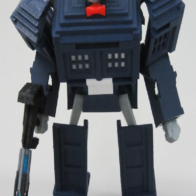 Major update on 7/11/2013: Slightly redesgined nearly every part for better printability and durability. Redesigned the elbow joint to keep the forearms from falling apart as easily and to make it easier to get it into Tardis mode. Got rid of the sliding black bar mechanism in the back, that idea didn't work out well, replaced it with two smaller fixed bars instead.