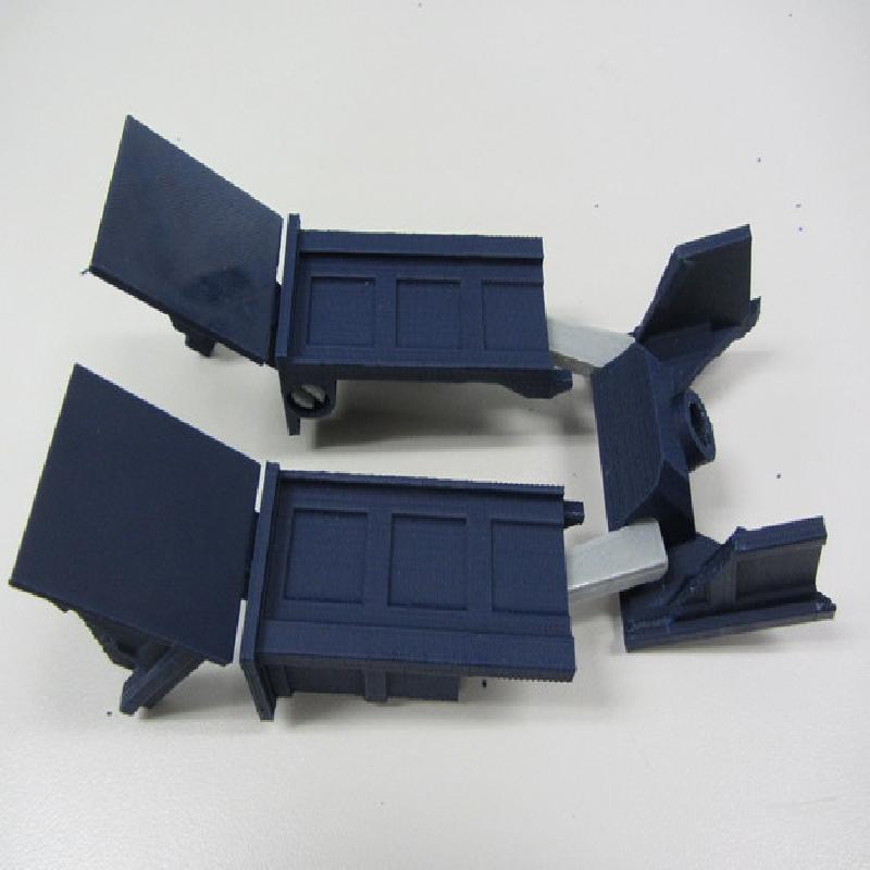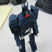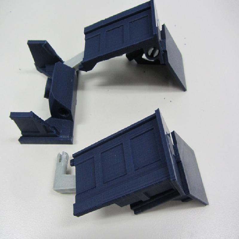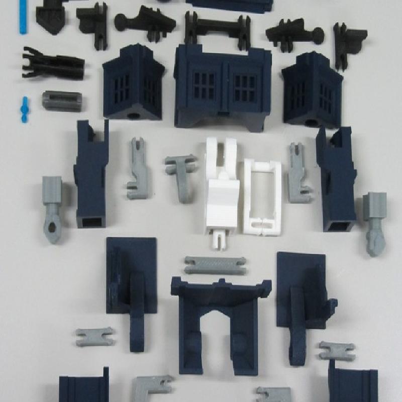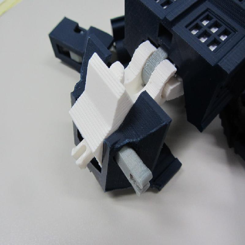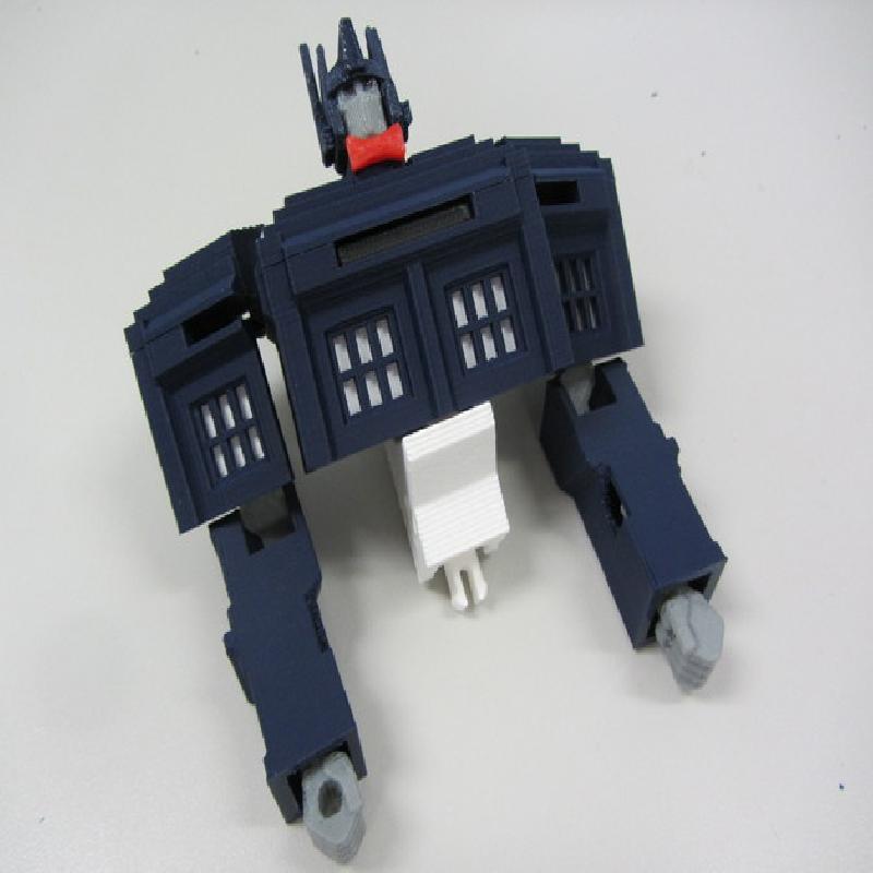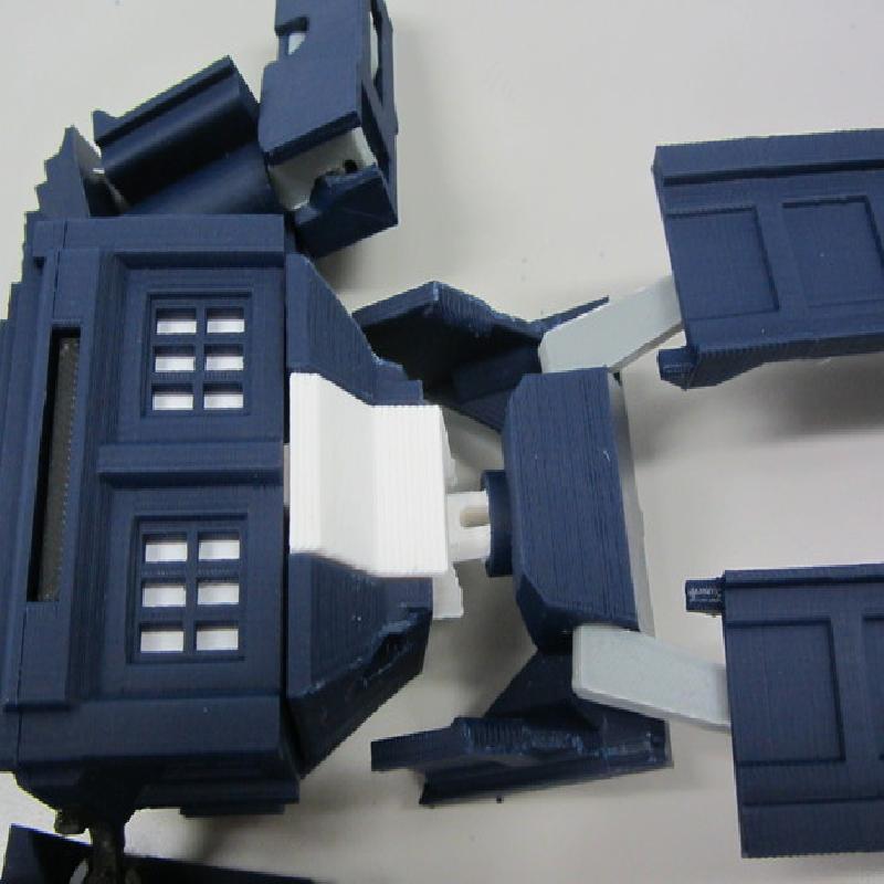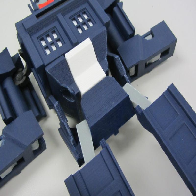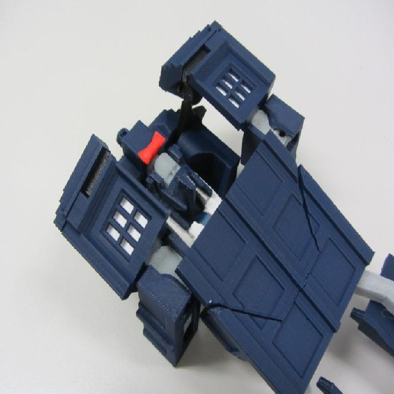 12/11/2013 update: Major tweaks for printability and easier transformation. I've added in a linkage between the abdomen and the head pivot so that the abdomen automatically slides up into the torso when the head pivots forward, and selective interference between the shoulder bars and abdomen mechanism to make the transformation process easier and more obvious. I eliminated all the fragile vertical tabs in the torso and shoulder blocks and made the shoulder ball-in-socket joint more robust. I have also completely redesigned the hips to make them easier to print and add a little bit of waist rotation. The legs and knees have been tweaked to stand more reliably and fit better together in Tardis mode. Also many other minor changes for durability and ease of priting and assembly.