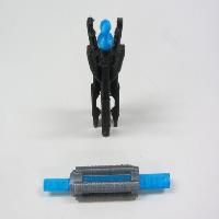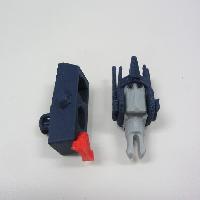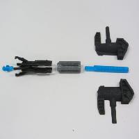 Finally, the base of the head pivot link snaps into the socket at the rear of the head pivot. When these are all together they should form a four-bar mechanism that links the rotation of the head pivot to the movement of the torso link, so the abdomen will rotate up into place as the head rotates forward. There is also deliberate interference between the torso bar and tabs on the shoulder bars so that swiveling the shoulders outward forces the head to pivot partially forward.