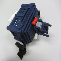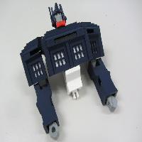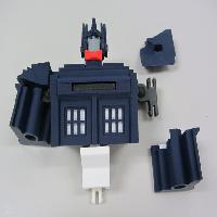 This design is scaled to two-thirds the size of the original. It takes about one-third the plastic to print. It has about half as many parts, and is easier to assemble. The transformation sequence is simpler. Thanks to some interlocking tabs, the toy holds together very firmly both in robot mode and in Tardis mode. Due to the reduced weight and the redesigned joints, the robot easily stands on its own unsupported.