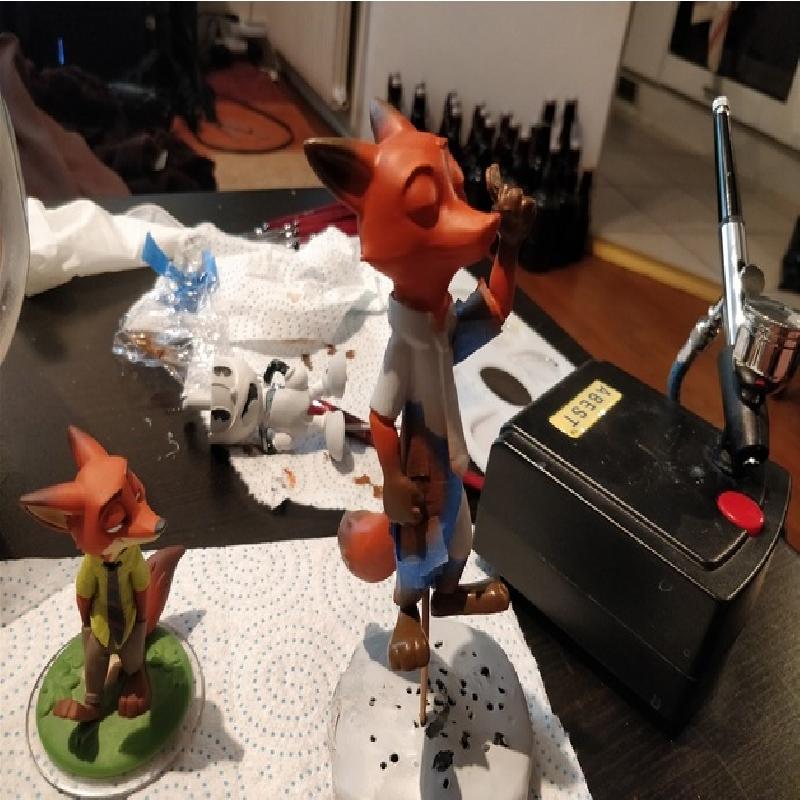 Then, I used airbrush to paint the big parts, easy, but I tend to rush a lot and not wait for a color to dry completely before beginning the next one (I hate waiting for these kind of things). So I had to begin again and again some color because wet paint don't really like the stickiness of the blue tape..