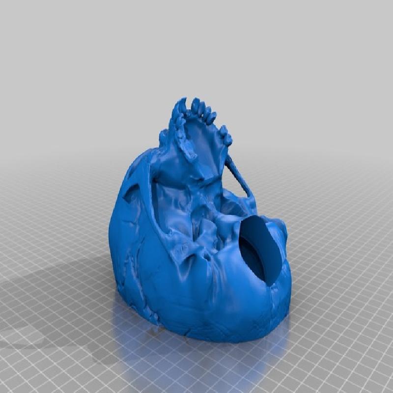 I took MakerBot's skull model and used the Sculpt feature in blender to make it a bit more fantasy-like, as if it's an orc skull or just an angry looking, mangled skull. I pushed the 'eyebrows' down to give that angry, sloped forehead look, slightly skewed the nose and cheek bones to make it less symmetrical and made a few dents and gashes in the forehead, to make it look somewhat battlescarred. I also removed some of the teeth and filled in the gaps.