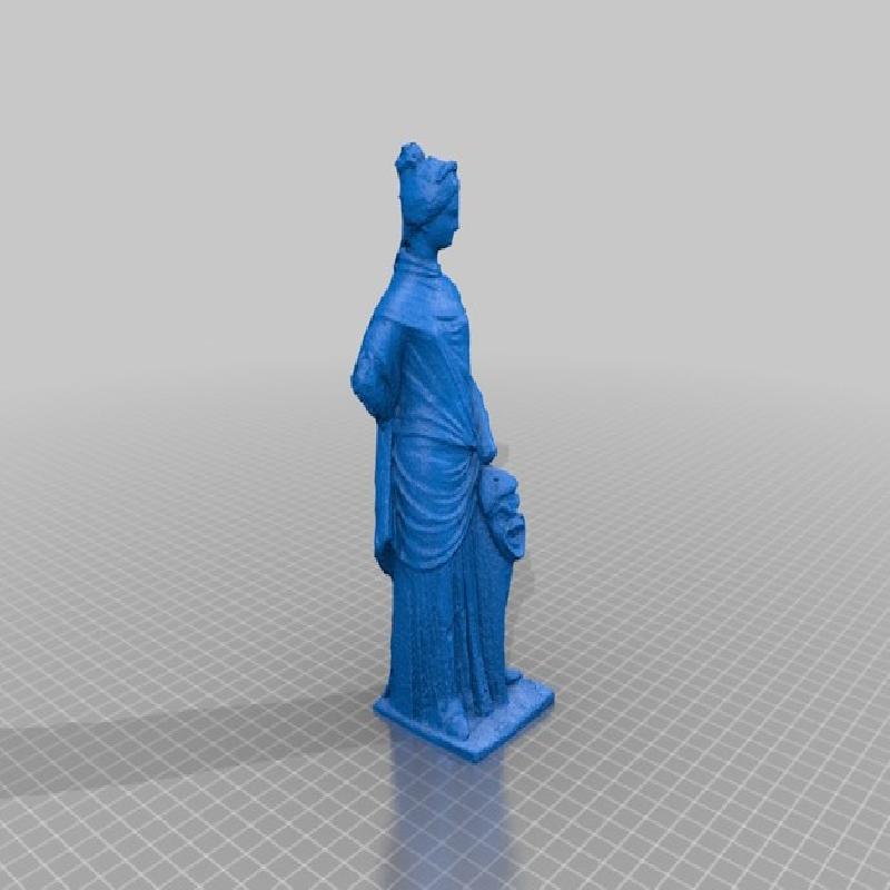 Young woman holding in her left hand a mask of comedy. This figurine, probably dating from the 19th century BCE, as the representations of the Muse Thalia who also holds a mask. The new comedy, comedy of manners, presents a plot centered on an impossible love.