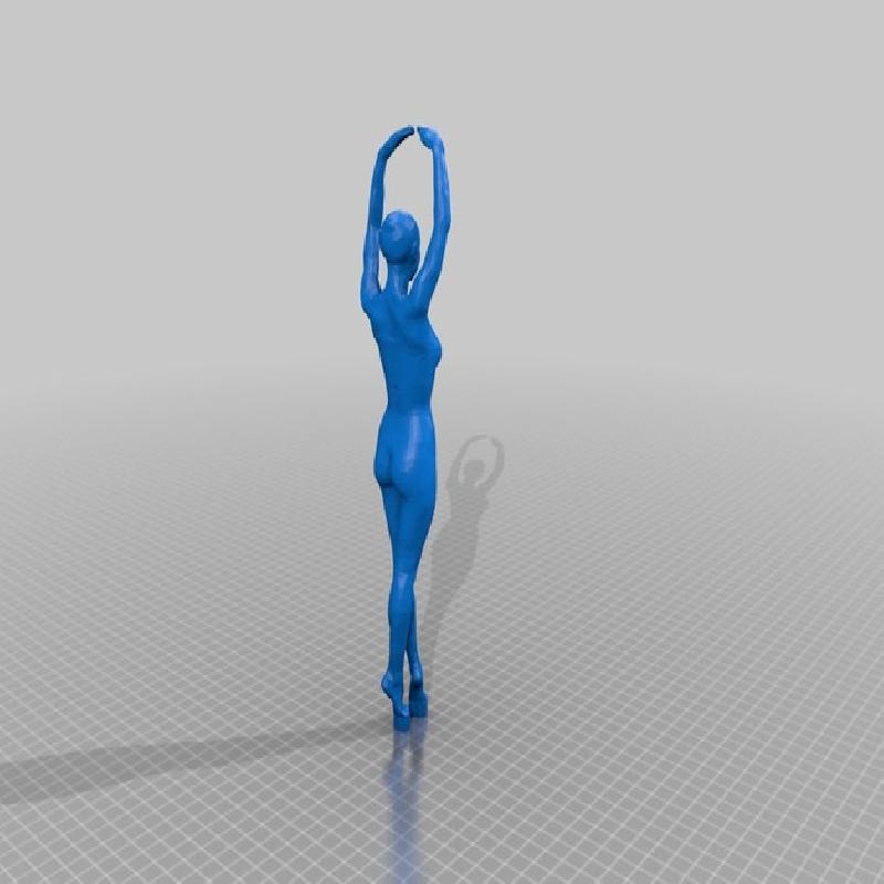 The bottom of her feet have been extended so they plug into the base (see image). Good foot contact is normally required for a successful print, and so the figurine can stand, which is why she is not en pointe, like a typical ballerina. That also requires special shoes, and she is barefoot in the scan session. Nova does have ballet experience though, so I consider this pose legit. :)