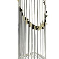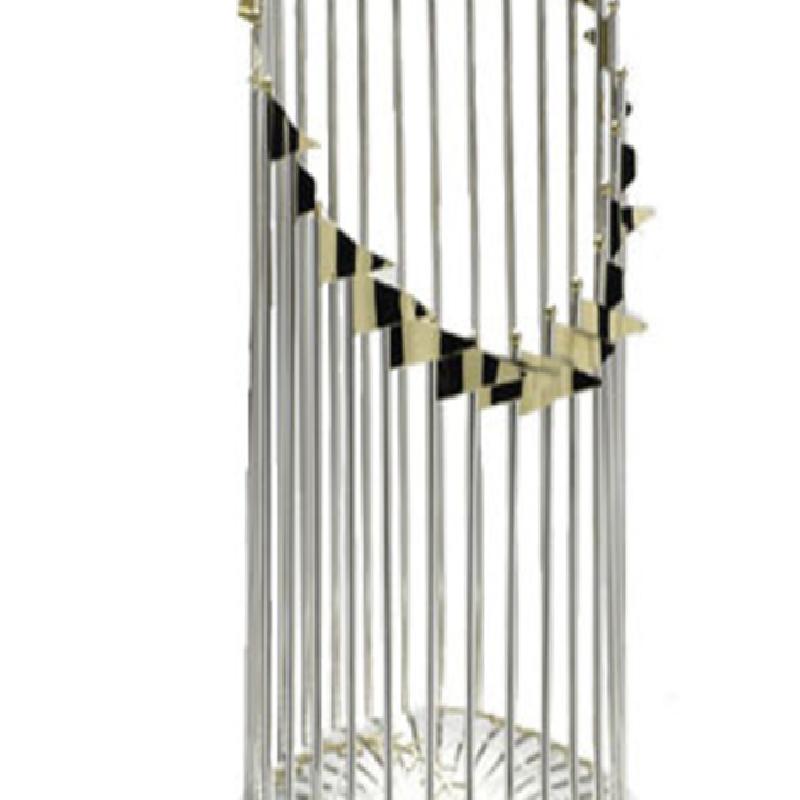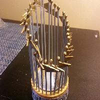 A model of the World Series Trophy (Commissioner's Trophy) for Major League Baseball. This is based on the current version. The base says "World Series Champions," and there is a baseball on top of the base. There are 30 flags representing the MLB teams around the top of the base.