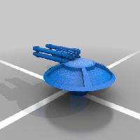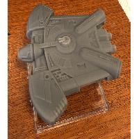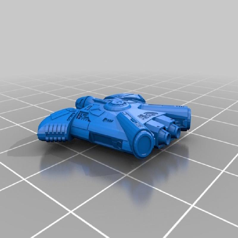 Starting with cyberia23's model in Blender, I used a shrinkwrap mod to create a new model with a solid outer shell suitable for printing. I then made a bunch of modifications to the shell to suit my personal design and to match the ship from the RPG.