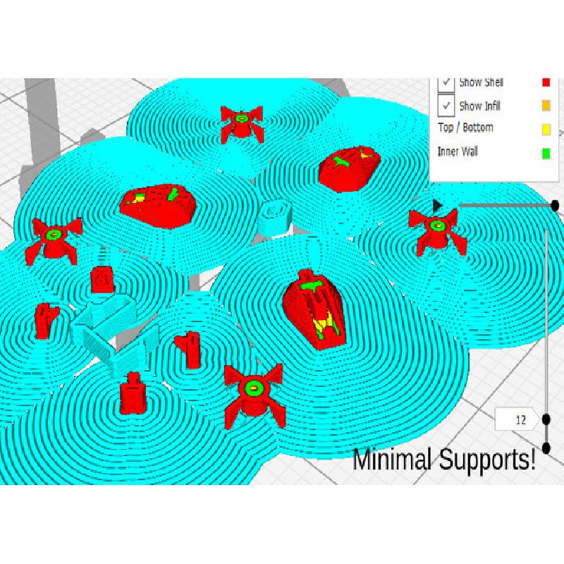 I used a brim because the parts are so tiny. I don't think it will print very well scaled down, or at a layer height larger than 0.1mm, but it should scale up pretty well - if anyone prints a big one, am very interested!