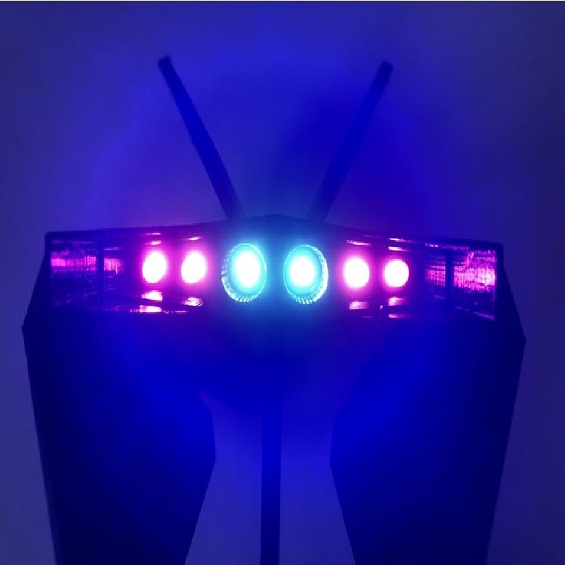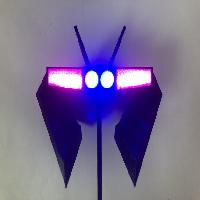 Solder a resistor in series with each LED, then wire them in parallel. Insert each LED though the peg hole and fit it trough the holes at the rear of the model (blue in the center, pink in on the side).