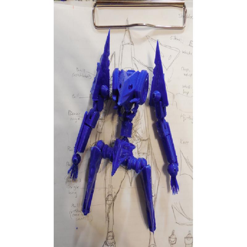 Designing joints for the figure was the first problem. It just takes a lot of trial-and-error to get right (and still isn't quite good enough tbh). Added onto the resolution limitations of my printer, the joints ended being pretty big. This basically defines the minimum size of the figure to be about 20 cm, or 1:100 scale (the Figmas are about 1:144, or about 14.5 cm). I made ball joints, single hinge, and double hinge joints. Test runs with the joints were fine, but after switching spools of filament (same maker, same time, supposedly same material, different color), the ball joint sockets are just... bad.