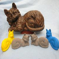 The cat seems to have been constructed from a single flat sheet of clay, possibly pressed into a mold, the edges folded over, covered with glaze, and fired. A stylus was used to make an inscription on the bottom: Judy 5 - 06. Perhaps the work of a student - see the photograph.