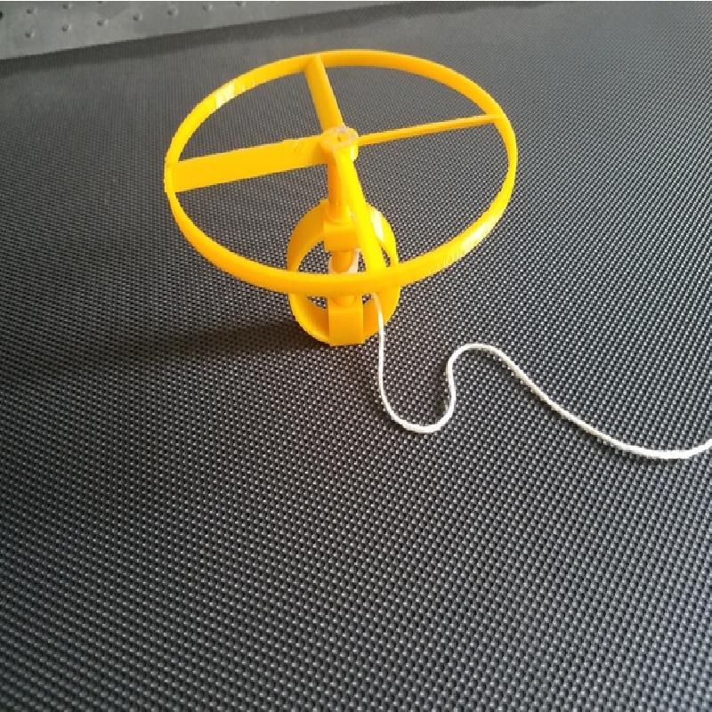 Pull string flying propeller toy. I designed the handle and axle connector in OpenSCAD.