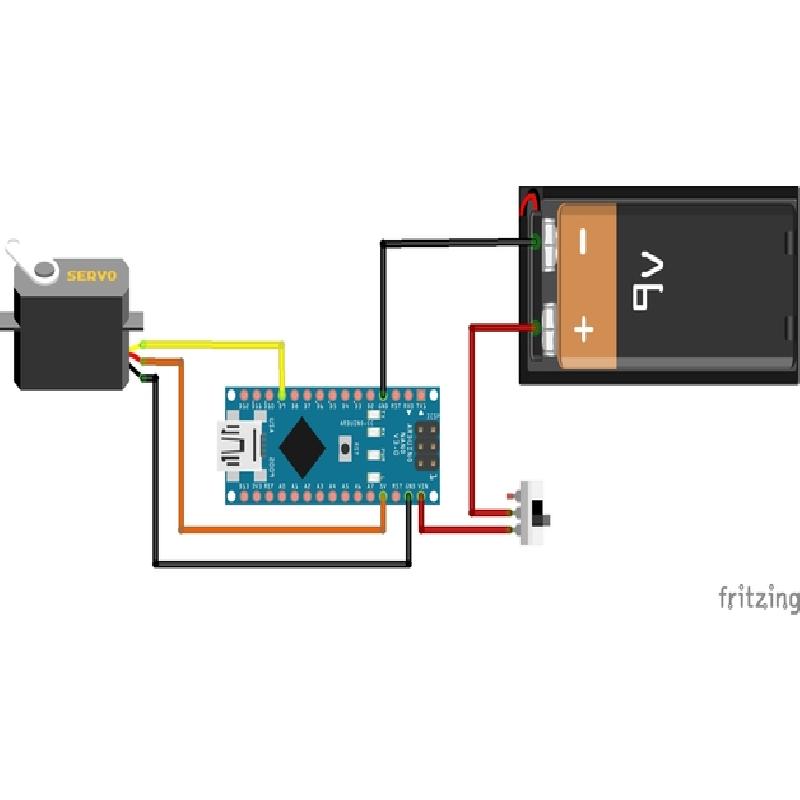 Everything is powered by 9V battery and Arduino Nano, mainly to set the speed of the servo motor. You could skip arduino and connect servo directly to the battery if you like.