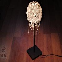 A 3D print of it is photographed with a plain black IKEA lamp base HEMMA, (Table Lamp Base small size).