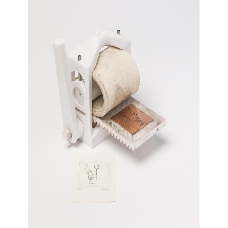 This is the outcome of my Intermediate-exam at KISD Köln International School of Design. After about 7 years of printmaking at Kölner Graphikwerkstatt (http://www.graphikwerkstatt.de/) I thought I should give the world a press that is not as expensive, heavy and huge like any other printmaking press. I figured that the unavailability of a press is one of the main challenges for people that want to try printmaking. That's why I decided to create one with my 3D-printer! Over the course of 5 months I built 10 prototypes, printed more than 100 proofs and used a kilometer of filament. And I got it working! The final prototype is able to print on a 70 x 100 mm paper!