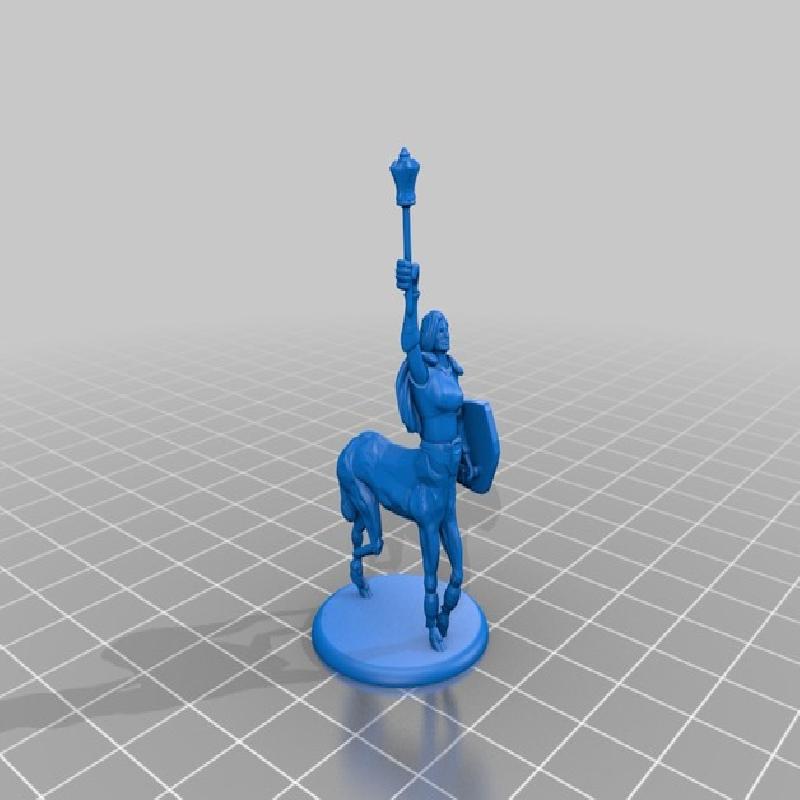 Took the centaur half from "Centaur Guard with Axe" and took the humanoid part from MZ4250's female Cleric with Axe, from Shapeways.