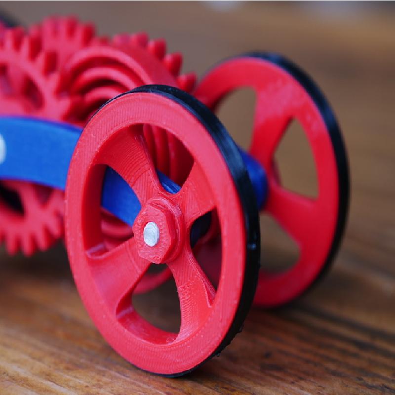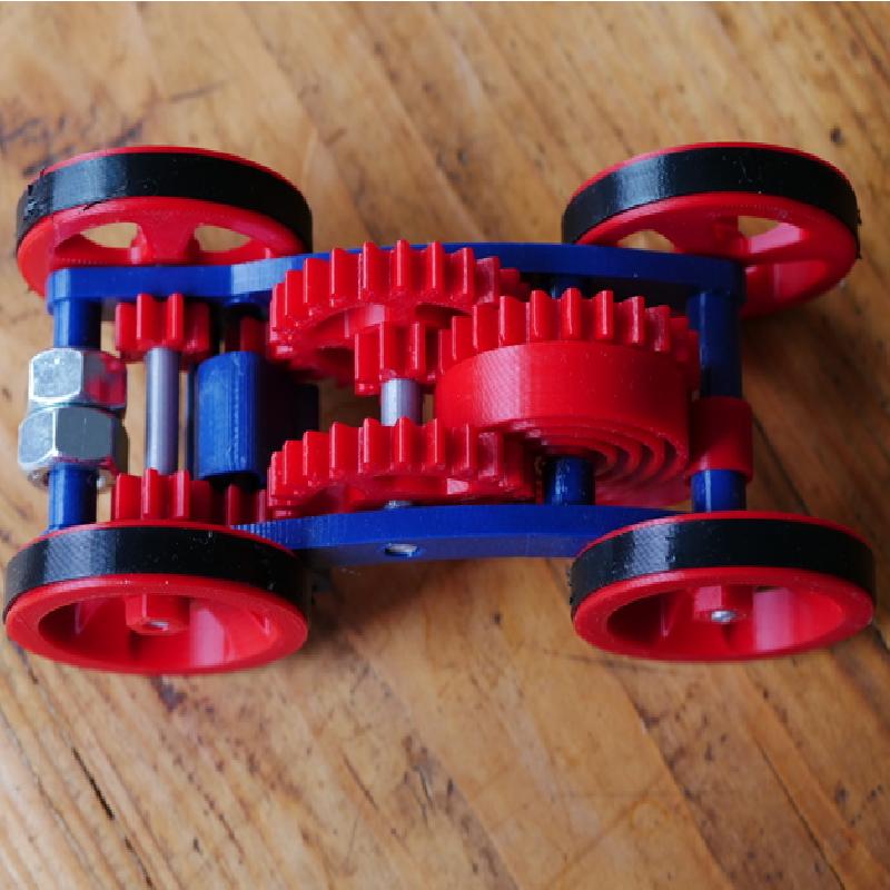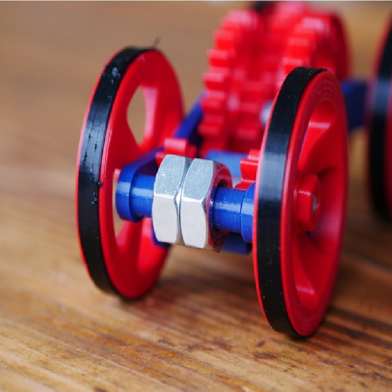 My tire design is actually the result of quite a bit of testing in order to resolve the problem of the wheels trending to spin causing the car to spin itself. My finding was that the problem is less the friction between tires and ground, but rather the light weight of the car. So I added an additional thread to add some steel nuts (M10). These steel nuts are not mandatory but recommended.
