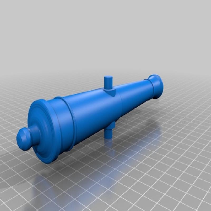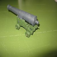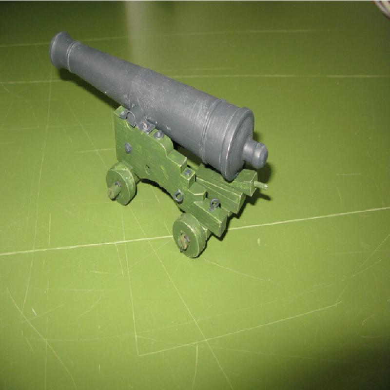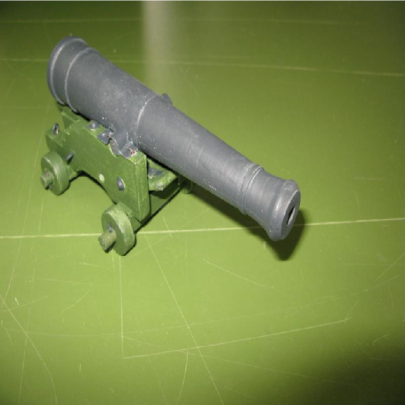 Model of a french 6pdr naval cannon napoleonic area. Model designed in 1:12 after printing cannon bedpost covers needs to be made from sheet of metal and eyelets from wire, according to image.