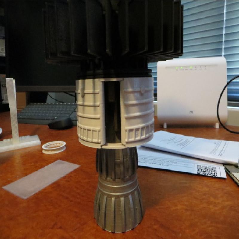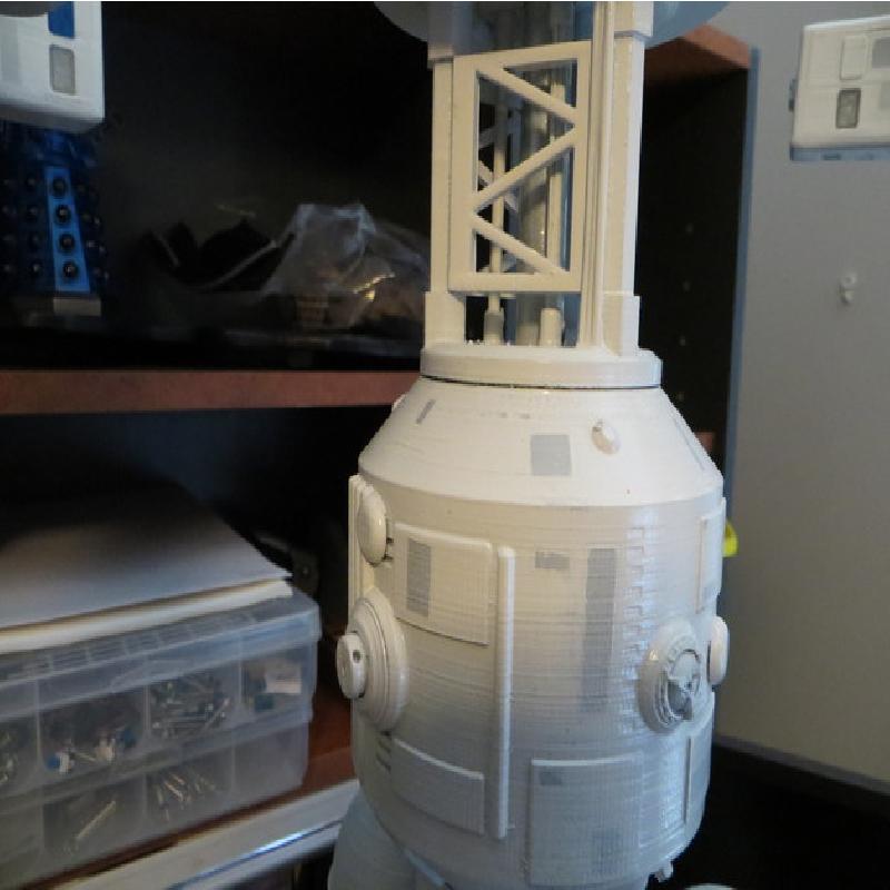 Big model 1.4 meters in length, scale 1mm =200mm, rotating habitats can be lit using LEDS so can command module, use 2 part epoxy to glue parts together, main struts are plastic curtain rods cut to size, an aluminum rod runs thru the middle for extra strength
