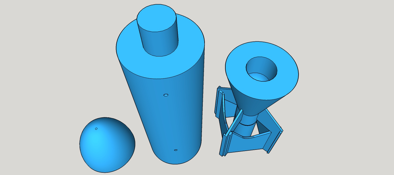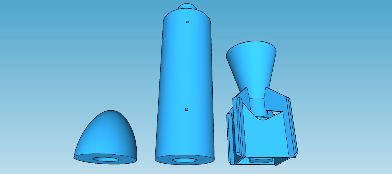 The nose cone goes on top of the body peg. That will make the places for the hangers end up in the right place. The peg that prints under the fins is used to fix the tail to the body.