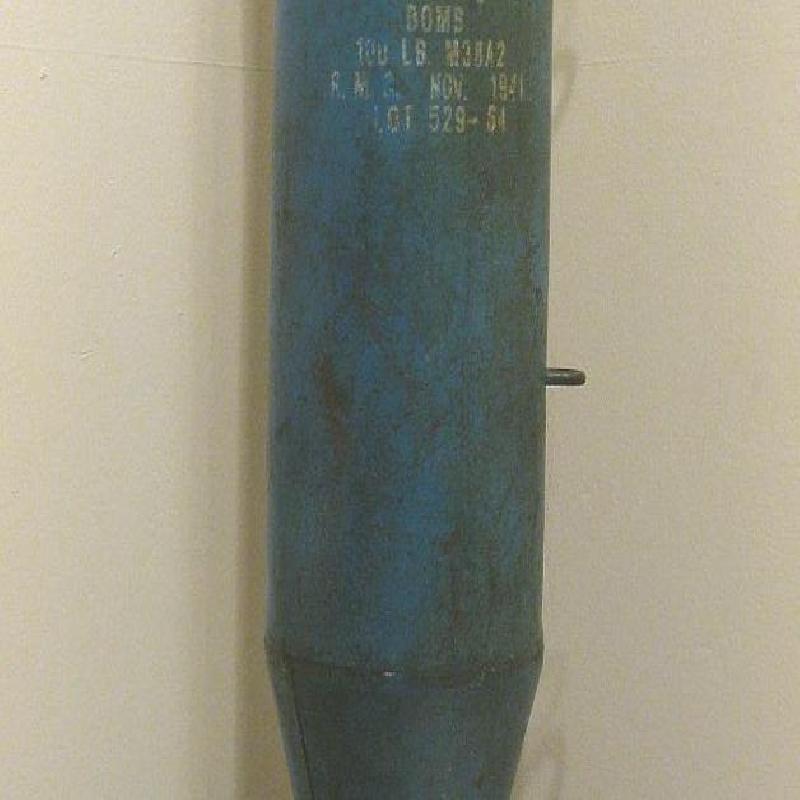 This is a 60.86 mm diameter by 352.49 mm high model of the M38A2 100 pound inert practice bomb. This was filled with sand and sometimes a small marker explosive then used during target practice in the forties and fifties. The originals were 48 inches long with a 9 inch diameter. The sheet metal is slightly off scale to make the fins 2 mm thick so it is easy to print on an FDM machine. If you scale this so it's 304 mm high ( .862 of it's height ) it would be quarter scale. One of the assembly pegs is under the tail assembly and doubles as a support during printing. Glue together, add eyelets and finish as desired. Should print pretty well without supports but you might wanna turn them on anyway for the underside of the fins and between the peg and tail assembly.