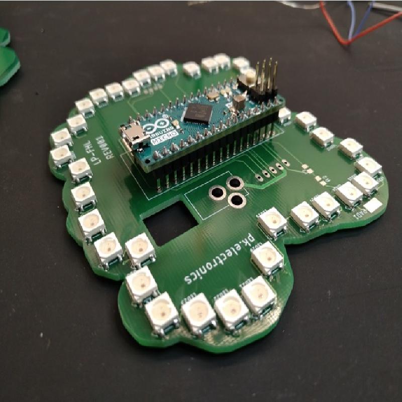 I decided to create a custom PCB which could fit just inside the hollow exhaust cloud to make an awesome piece for my desk. The PCB was designed using Fusion 360 and Eagle from Autodesk. It features 38 individually controllable rgb leds (WS2812b), an Arduino Micro and some expansion headers.