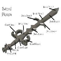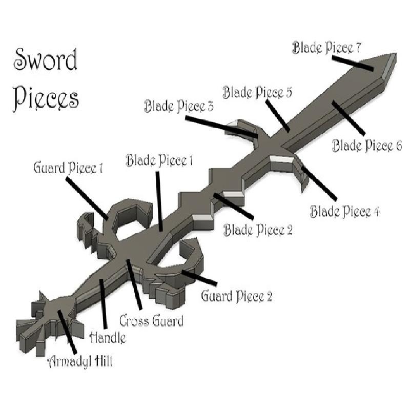 In the files you'll find the 12 pieces it takes to print. I printed each piece laying flat. No supports or rafts necessary. Versions of these pieces with and without the hole for the dowel rod are included. Also, if you'd like to cut it down further yourself or scale it to fit your fancy, the files include the entire sword in one piece, both with and without the hole cut for the dowel rod.