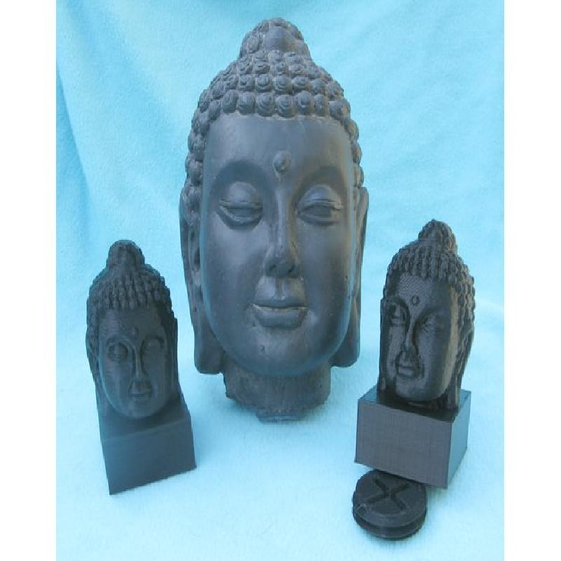A thrift store bust - a Budda head. It's black, about 150 mm high, and weighs nearly a kilogram. Here is an Autodesk Recap Photo copy; at 40% scale and placed on a square prism. A container version can be weighted with pennies and serve as a desk ornament. It holds 60 pennies - around 5 ounces.