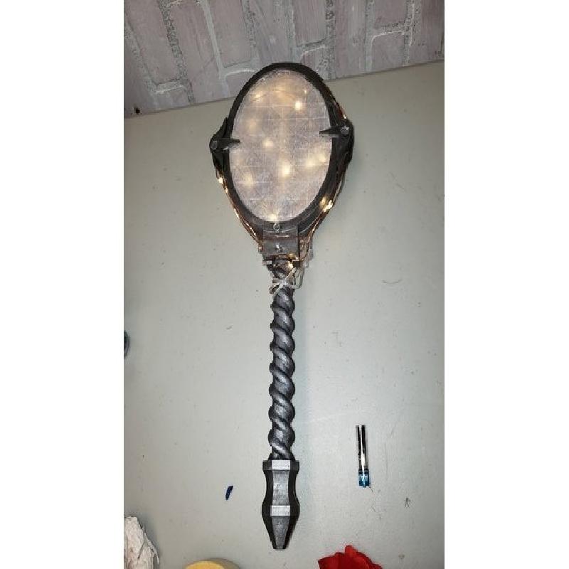To repair it, I ran a dowel down the handle that was the length of the mirror. I hot-glued it to the inside of the mirror to give the whole thing more stability. The second version of the lights was done by winding fairy lights along the inside and sides of the mirror. Unfortunately, the mirror head was not deep enough to fit the fairy lights controller, so I just painted it silver and glued it to the back. If I were to make this again, I'd probably design it a bit differently.