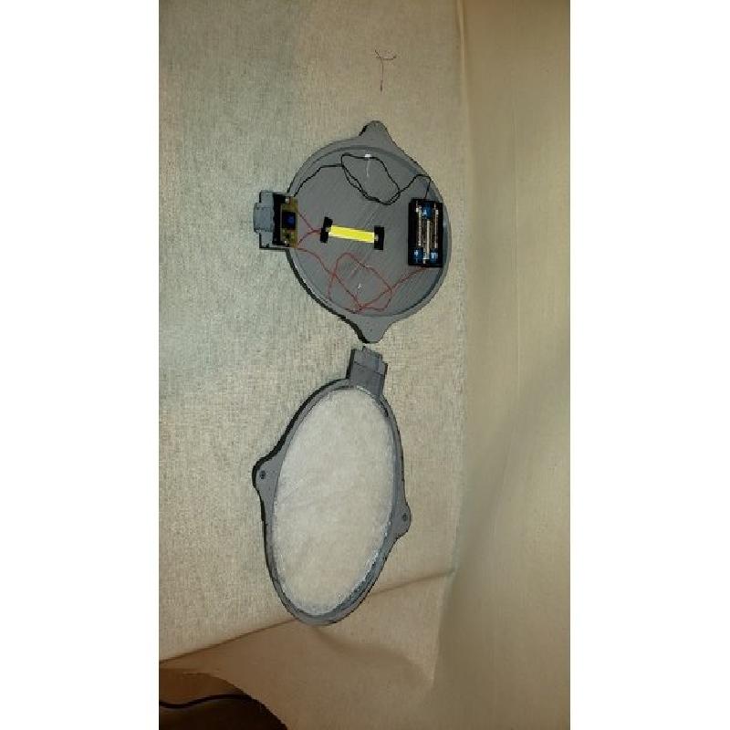 I build this for a high school production of Beauty and the Beast. It was actually modeled around a free LED light from Harbor Freight. The face of the mirror was cut from a Ferrero Rocher plastic box and lined with parchment paper for additional diffusion. There's a picture of my original wiring in the images. To assemble it, I drilled two clearance holes in the raised shapes on the side of the mirror and used 1 1/4" drywall screws to secure it. I hid the screws with glued on gemstones.