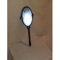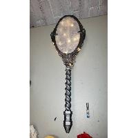 Unfortunately, the original design did not quite stand up to the rigors of the stage. The electronics took up too much space in the body of the mirror, so I couldn't anchor the handle as securely as Belle running home to save Maurice needed. The head of the mirror fell off and somehow (this part I don't understand at all) the plastic battery holder inside shattered even though nothing else inside was moved so batteries were rolling around inside.