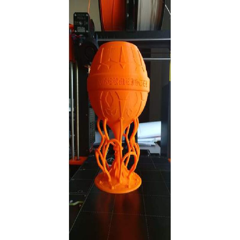 The Chalice - or goblet if you will - has many random shapes extruded in/out. Also the text "JÄGERMEISTER" engraved in the center with a slow as hell gothic font. They all turned out fine. Downsides: as you can see from the pictures (model not touched after printing) the tubes have some webbing. Also some grooves on the lower part of the bowl, on one side only. But overall I am very happy with how it ended up. Avoid the webbing on the tubes. Because if its too ruff they might wiggle with the nozzle until they break the whole tube free from the bottom plate.