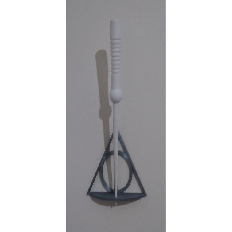 A Deathly Hallows sigil to hold 5 wands. At 100% the holes are 3mm, and may need to be drilled out to fit your wands, or you can scale up the design.