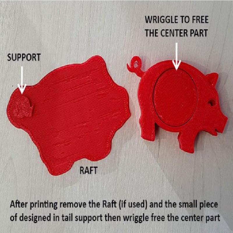 With the Raft and Support removed the only other post print work required is to free the centre decoration part on the 'spin' versions. If well printed this should break away with relative ease by wriggling this part within the outer body of the pig. If it has fused slightly running a craft knife or finger nail around both sides of the groove between the parts should help free it.