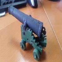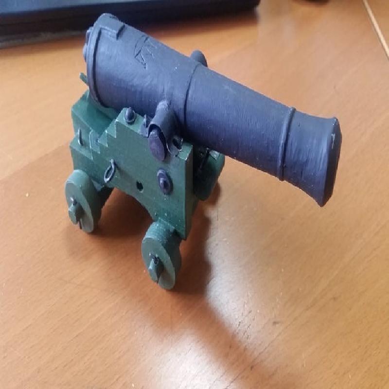 Model of a italian 8pdr L14 naval bronce cannon napoleonic area. Model designed in 1:12 after printing cannon bedpost covers needs to be made from sheet of metal and eyelets from wire, according to image.