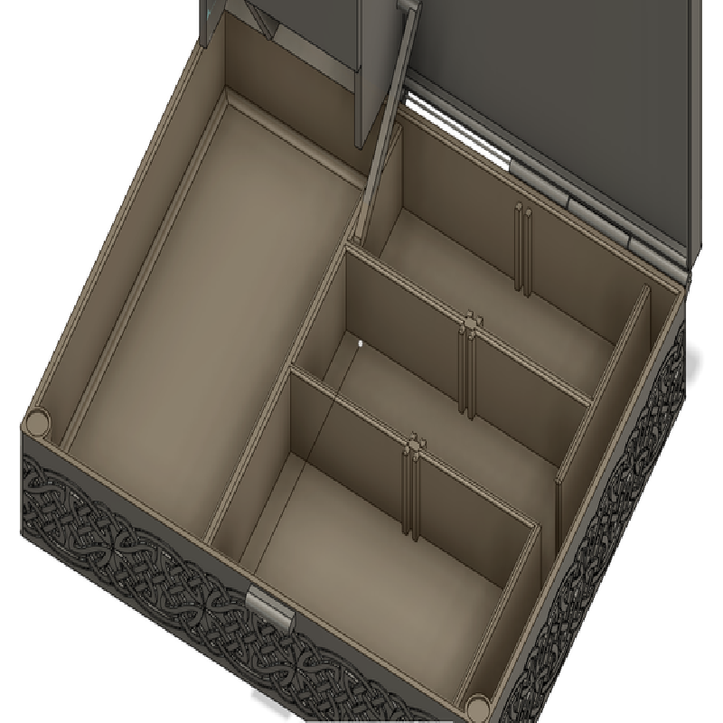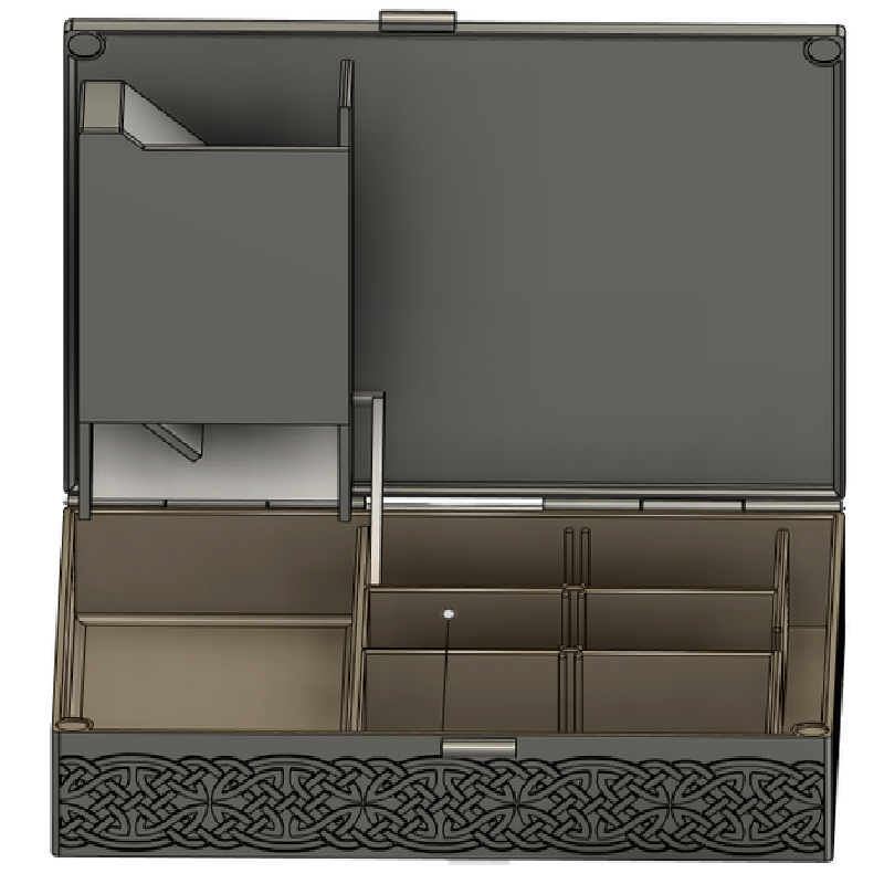 This is a 8.25" x 6.6" x 2.25" dice box with a built in dice tower attached to the lid. It has room for pens and pencils, 3 rows of storage with dividers available, and the tower in the rest of the space. The lid is printed in 2 pieces to allow a decorative cover to be placed without having to print with supports.