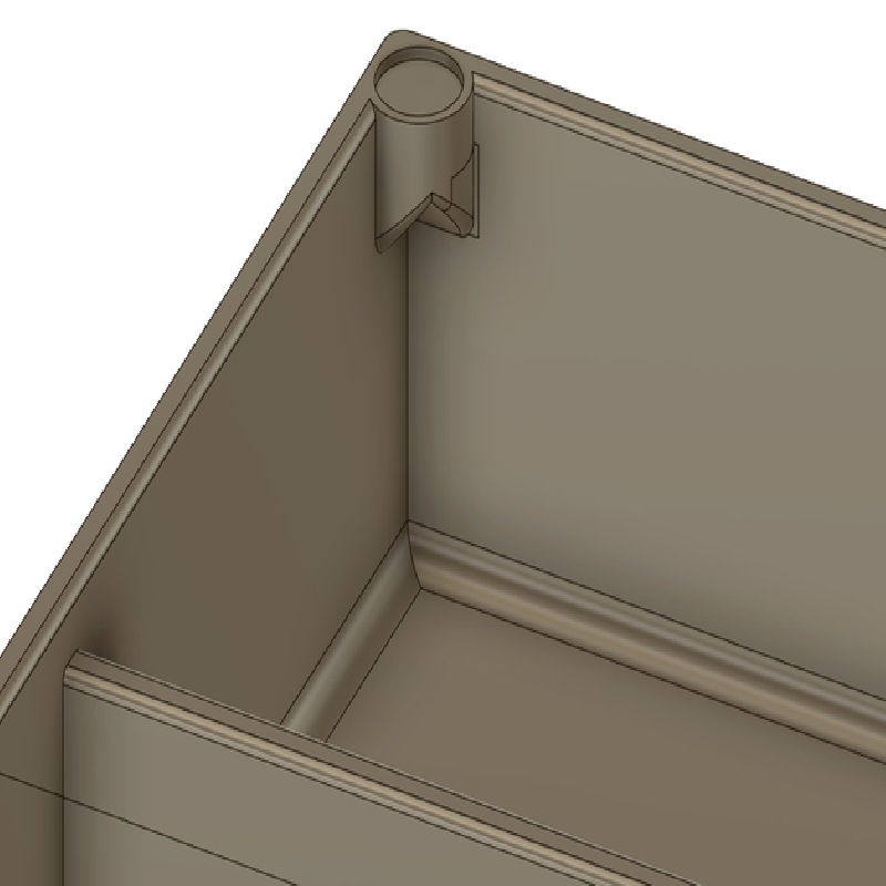 The hinges are assembled with paperclips and glued at the ends. The spots in the corners are for 8mmx1mm disk magnets. I may update with a spot for a 3rd pair. The holding pin allows you to keep the lid at 90 degrees.