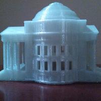 I printed this with Hatchbox Glow in the Dark PLA.  210 deg C, 60 deg C bed to prevent warping and used painters tape.  The bed temp was overkill - recommend starting low and increasing 10 deg C until warping goes away (if you have that problem). For scaling, recommend printing largest length at least 150 mm.  Larger and you'll have to try some custom supports.  The dome is hollow and contains the internal columns, bookshelves, and two sets of rails.  Windows are "open" so you can view the inside. Side walls are in progress and will surround the building, arch windows, under-arch, and railings.