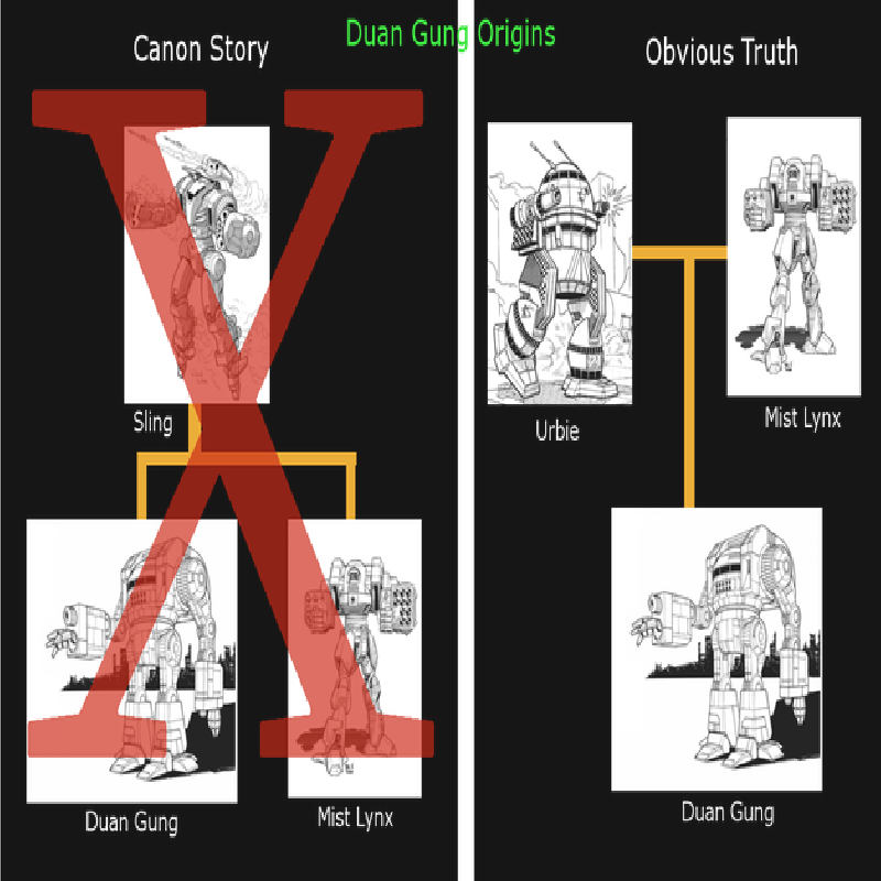 This is one of, if not the, ugliest mechs in battletech. Supposedly it is derived from the sling akin to the Mist Lynx... but that is obviously false. This mech is clearly the byproduct of an instantly regretted one night stand between an Urbie and a Mist Lynx followed by an abortion which this little monster managed to survive and then thrive in the Capellan Confederation. I have included a chart to show the proper lineage of this mech.