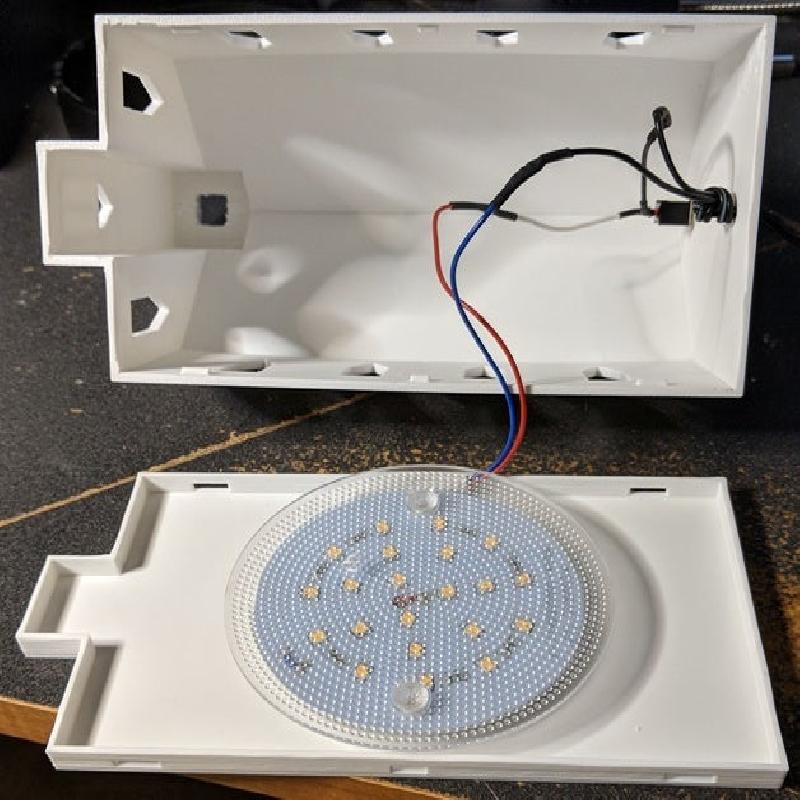 The base/bottom was printed at 0.2mm layer height and was designed to hastily fit a Portfolio 21675-000 LED lamp that was split into pieces. There are much cheaper ways of doing this, but I found it at Lowes for a last minute gift.