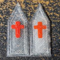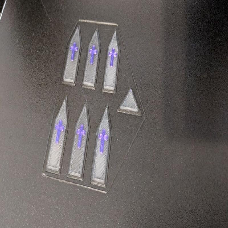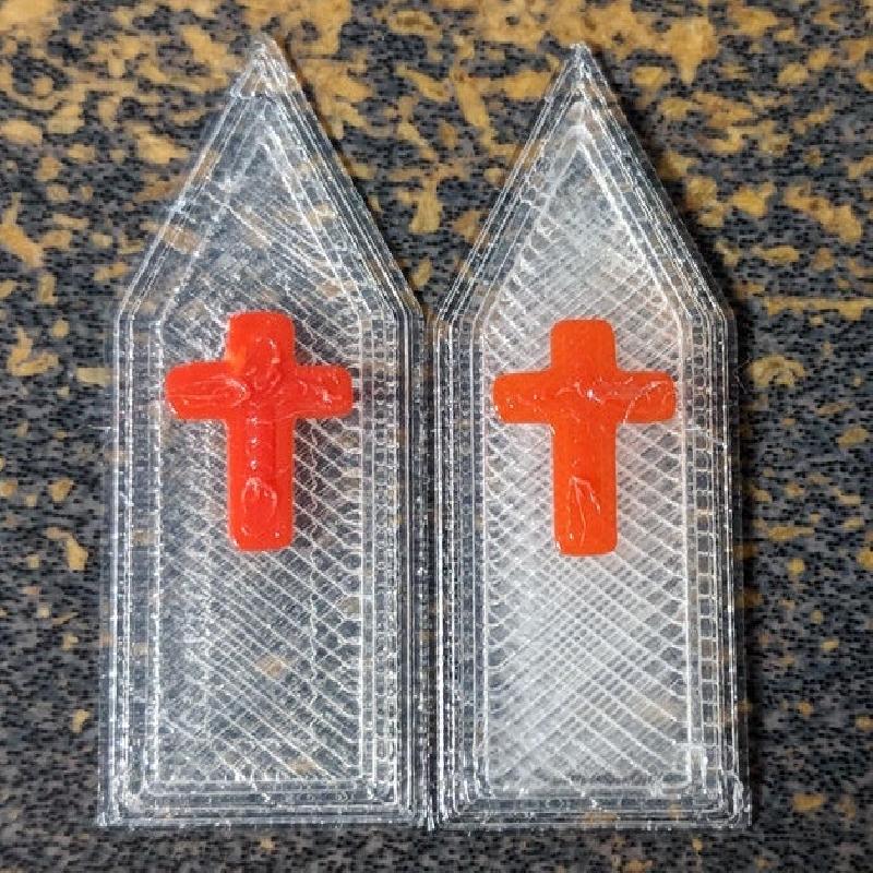 The windows were printed with Sunlu transparent PLA at 0.3mm. In PrusaSlicer, I added a 2nd color for the cross so that only 1-2 layers of the cross were printed with color (red and silk purple). The windows were superglued into the body from the rear. You'll need 10 of the stained glass windows (with varying colors if you choose) and 1 of the triangle windows. In the attached picture of the windows with the red cross, the left was an earlier thinner version that didn't scatter light enough, so the window thickness was increased.