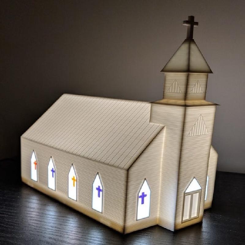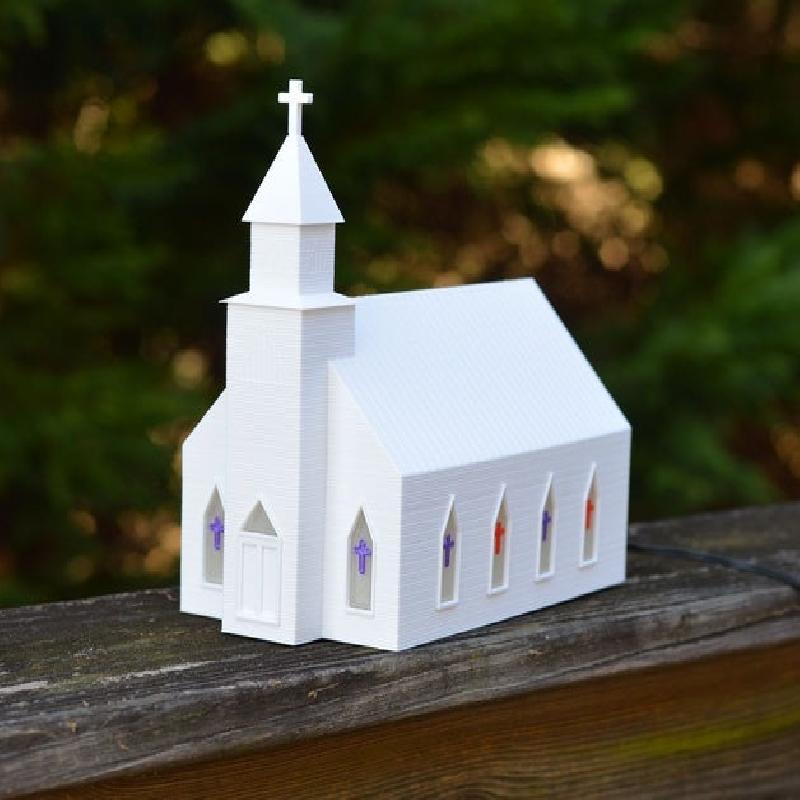 I attempted to print the spire at a higher resolution for the slopes (0.1mm), but got a bunch of boogers and globs. 0.2mm seemed to be a good compromise. On the top of the church body and mid spire pieces I drilled out the inner flat spot to allow light to flow all the way to the top of the spire, otherwise it looks a bit dark. The two spire pieces were superglued to the church body and the cross was a little oversized from elephant foot, so mild trimming with an exacto knife around the shaft left a solid press fit.