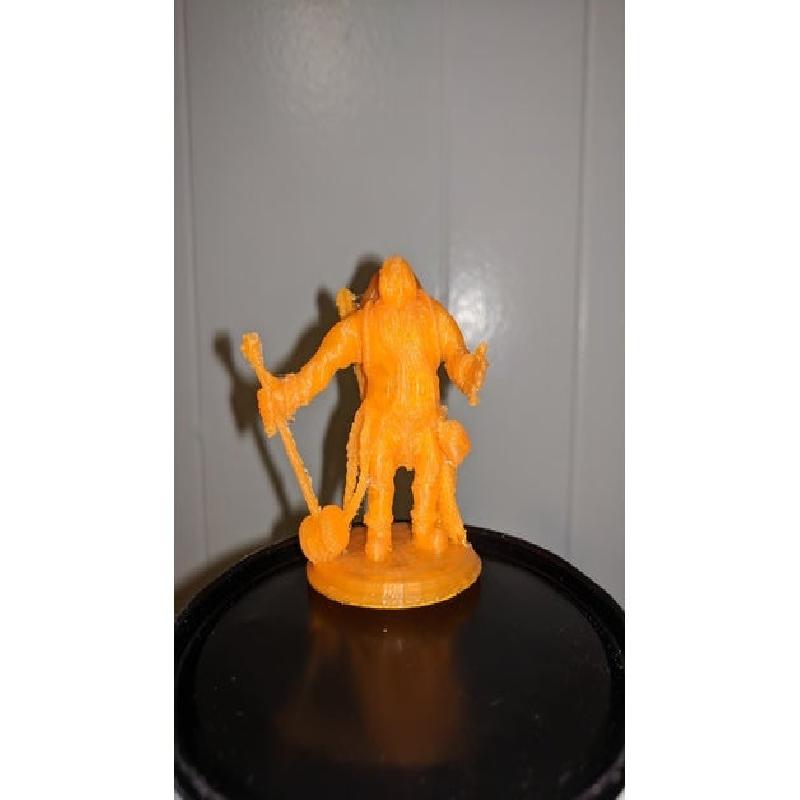 This is my Half-Ogre Warlock I played in a Baluder's gate game. I'm still working on him to make him look and print better, as well as figure out a way to get his Patron (a talking abysal chicken he keeps in that cage on his back) into the cage printed and visible.
