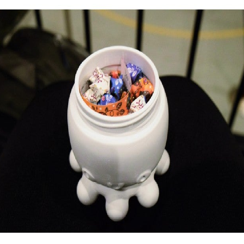 I remixed the octopus container top to become a grad cap that can unscrew, and I put some folded paper stars and little things inside. I made the tassel with some threads (yellow and blue were the colors from the school my friend went to).