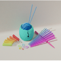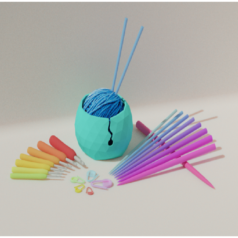 There are five knitting needles that range from 3.5 mm to 7 mm. As well as five different crochet hooks, that range from 4 mm to 10 mm. I've included an ico-sphare yarn bowl of my own design that can hold yarn balls of 10 cm in diameter (you can scale the bowl to be as big or as small as you want)